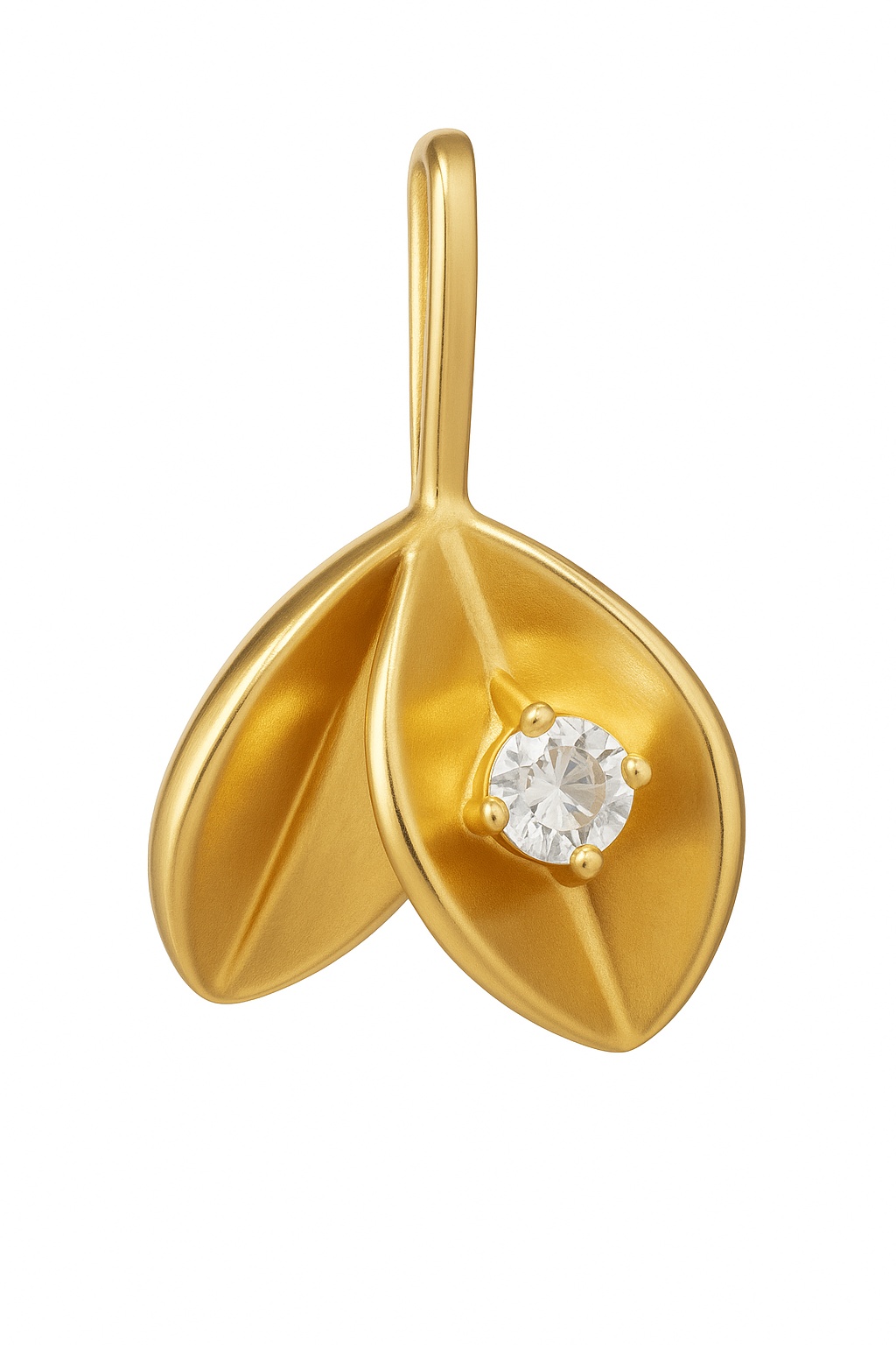 Vedhænget er udført i 925 sterlingsølv med en 18 kt forgyldning, der giver en varm og eksklusiv glød. Den glatte overflade og den let buede bladform skaber en harmonisk helhed. Den klare krystal er placeret som et diskret fokuspunkt, der giver ekstra spil i lyset uden at virke dominerende.