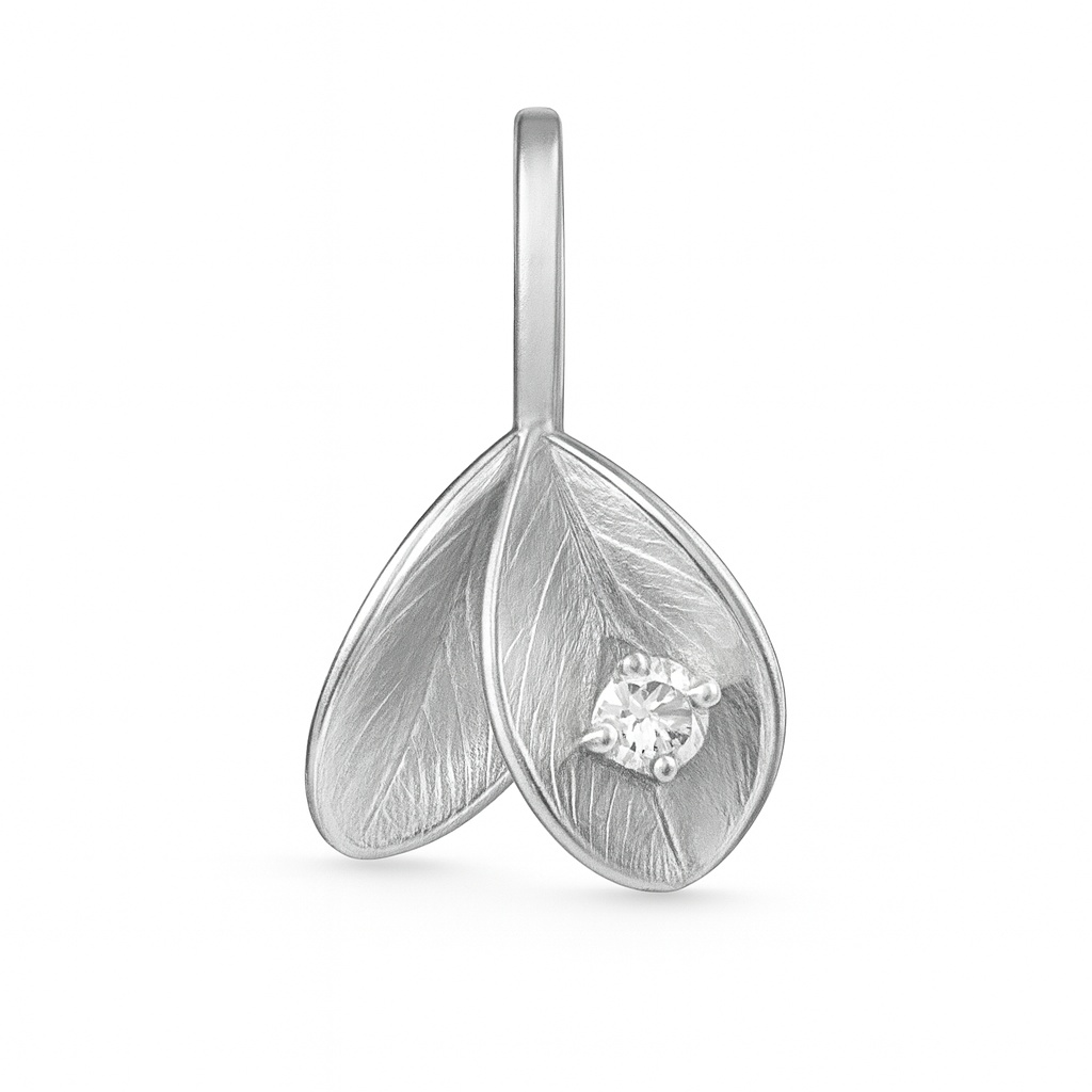 Vedhænget er fremstillet i 925 sterlingsølv med en rhodineret overflade, der giver en kold, klar glans og ekstra modstandsdygtighed over for anløbning. Den slebne krystal er placeret, så lyset reflekteres optimalt, uden at det tager fokus fra den bløde bladform. Resultatet er et smykke, hvor detaljer og helhed går op i en højere enhed.